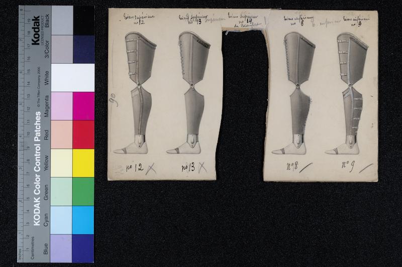 Jambe artificielle à flexion libre, armature apparente (n°12). Jambe artificielle à flexion libre, armature dissimulée (n°13). Jambe à flexion libre, armature dissimulée (n°8). Jambe artificielle à flexion libre, armature apparente (n°9)