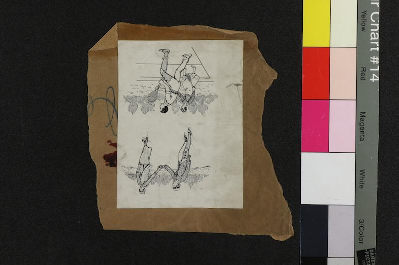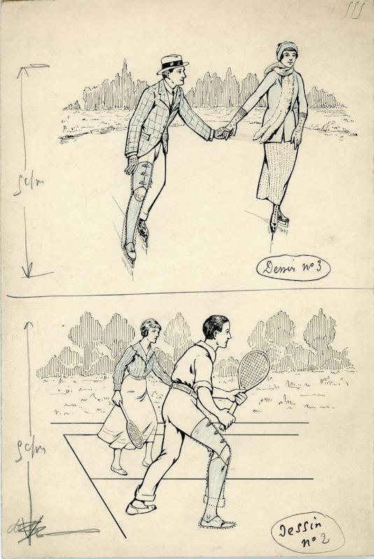 - Deux illustrations : Homme portant une prothèse de jambe patinant avec une femme ; Homme portant une prothèse de jambe jouant au tennis avec une femme (dessin et tirage)
