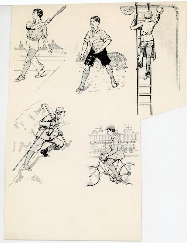 Cinq illustrations : Paysan portant une prothèse de jambe ; Lanceur de poids portant une prothèse de jambe ; Électricien portant une prothèse de jambe ; Cycliste portant une prothèse de jambe ; Postier à vélo portant une prothèse de jambe