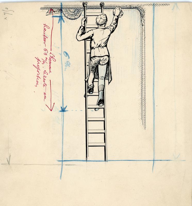 - Illustration : Homme portant une prothèse de jambe sur une échelle (dessin et tirage)