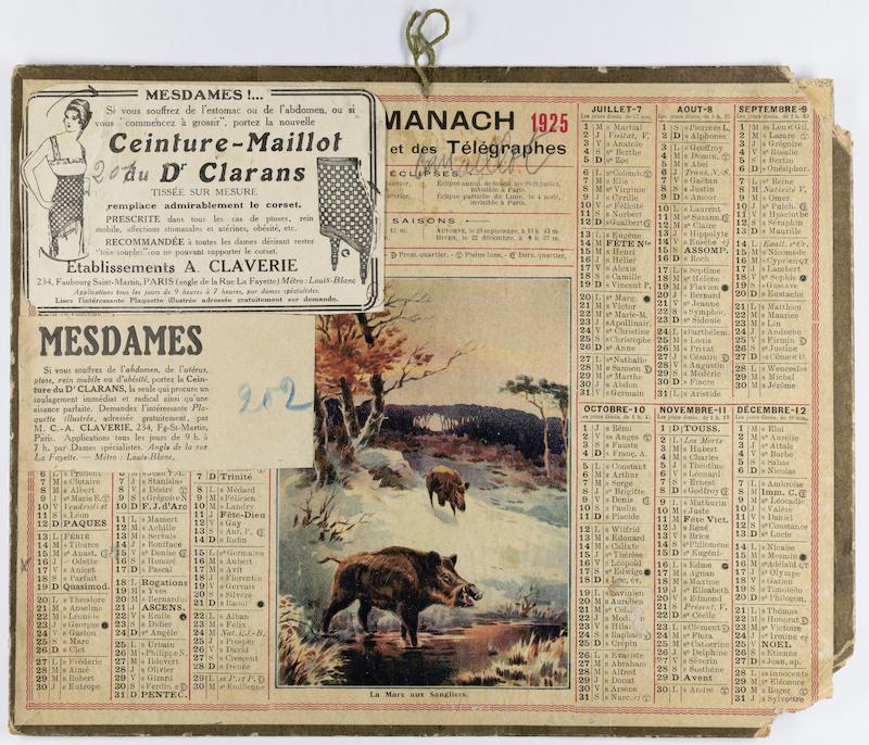 Encarts publicitaires pour la ceinture-maillot du Dr Clarans, par la succursale Claverie rue du Faubourg Saint-Martin à Paris, encollés sur un calendrier
