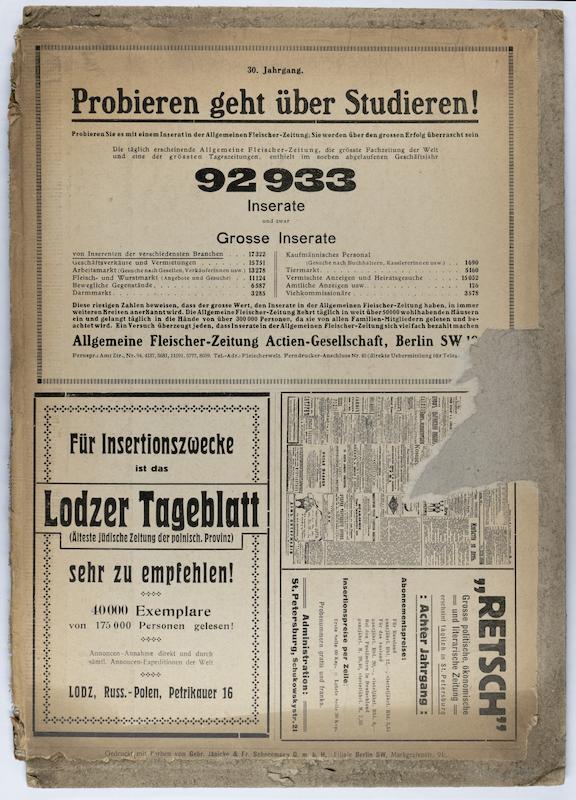 - Encarts publicitaires pour des périodiques germanophones publiés à Berlin, Lódz et Saint-Pétersbourg encollés sur un carton