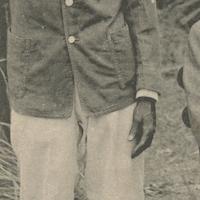Trois boys dont deux en tenue de service et un en costume complet avec chemise à col cassé, cravate, et chaussures en cuir