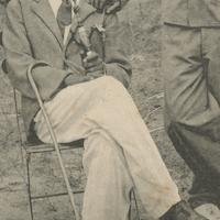 - Trois boys dont deux en tenue de service et un en costume complet avec chemise à col cassé, cravate, et chaussures en cuir