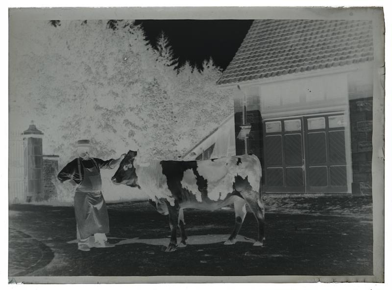 Homme tenant une vache, ferme de Buillon