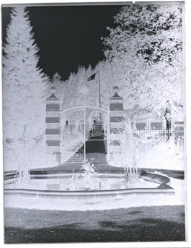 - Le jet d'eau devant la grille du château de Buillon, vue vers le parc