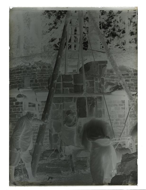 Remontage des piliers des ruines de l'église abbatiale de Buillon, James Tissot et des ouvriers