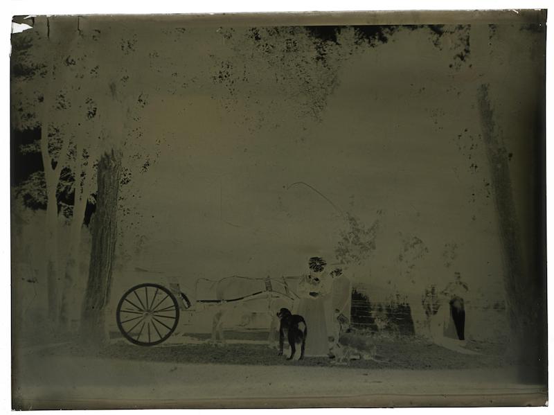 Femme et homme, chien autour d'un cheval attelé