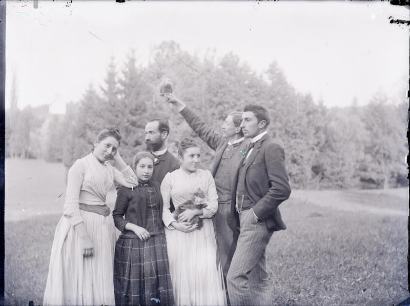 Trois femmes et trois hommes, en extérieur, avec un perroquet et un chien
