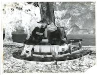 Le logis abbatial et le château de Buillon depuis les hauteurs, Tissot dans l'herbe au premier plan