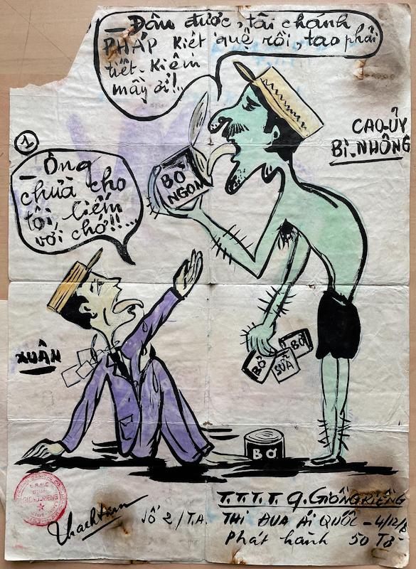 Xuân - Ông chừa cho tôi liếm với chớ!!... - Cao ủy Bi - Nhông: Đâu được, tài chánh Pháp kiệt quệ rồi, tao phải tiết - kiệm mầy ơi.